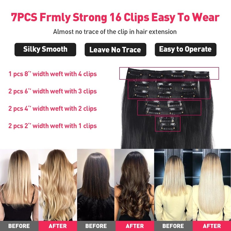 - 22 inches long, 7 pieces with 16 clips and weighing 170 g. It is easier and more comfortable to wear. High quality synthetic, tangle free, silky soft, looks and feels like real human hair.