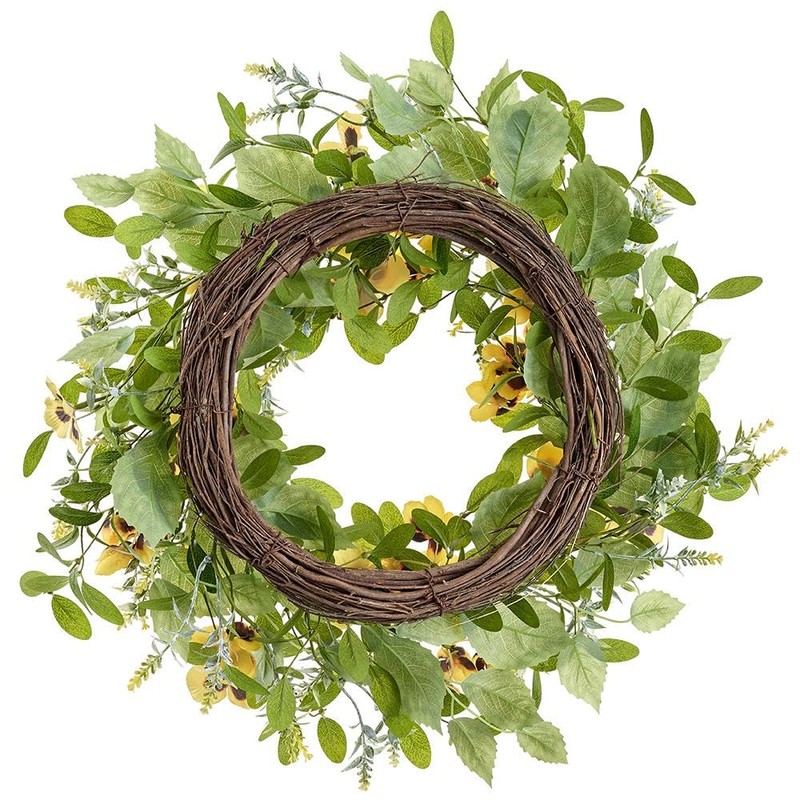 22" Pansy & Mixed Greenery Silk Flower Hanging Wreath -Yellow/Green (Pack of 2)