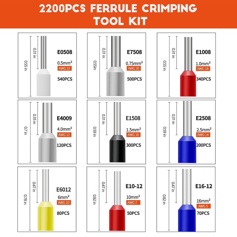 - Versatile Applications - Our ferrule kit includes 2,200 high-quality ferrules, accommodating a wide range of wire connections. Ideal for electrical maintenance, automotive wiring, machinery, solar panel installations, car stereos, and 3D printers!