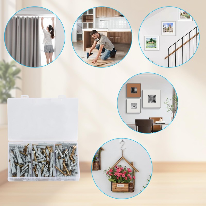 - Wide Application: Screws and wall plugs set is suitable for fixing home decoration, bathroom, curtains, lamps, cross-stitch, photo frames, decorations, decorative pieces, etc. on materials such as gypsum board, fiberboard, hollow board, solid brick, concrete, etc