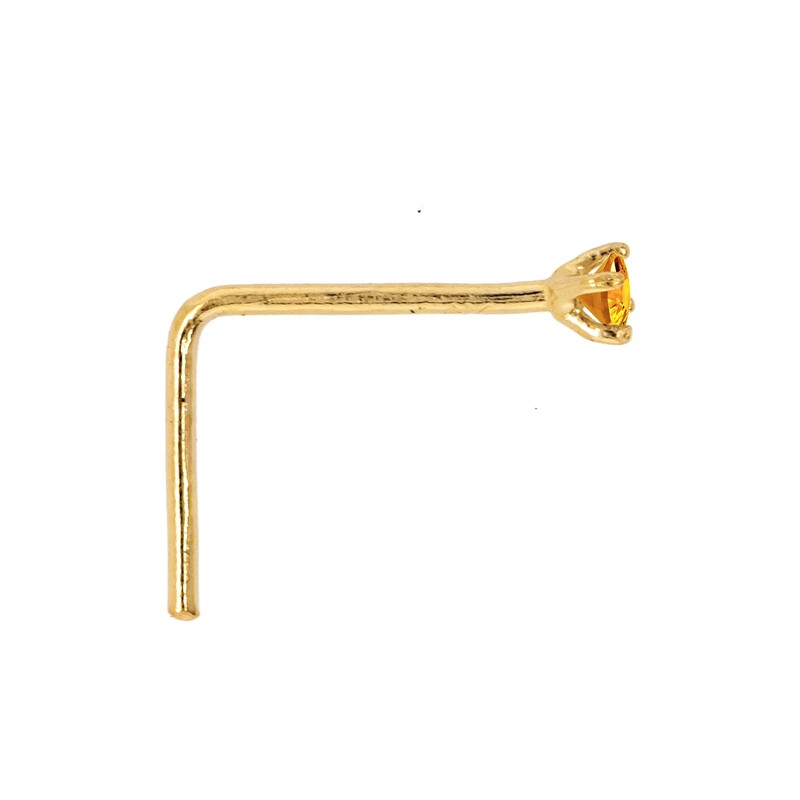 Choice of ONE PIECE 14Kt Yellow Gold or White Gold 22G L-Shape Stud Nose Ring with Round Brilliant Cut Citrine in 4-Prong Setting. November Birthstone Nose Ring.