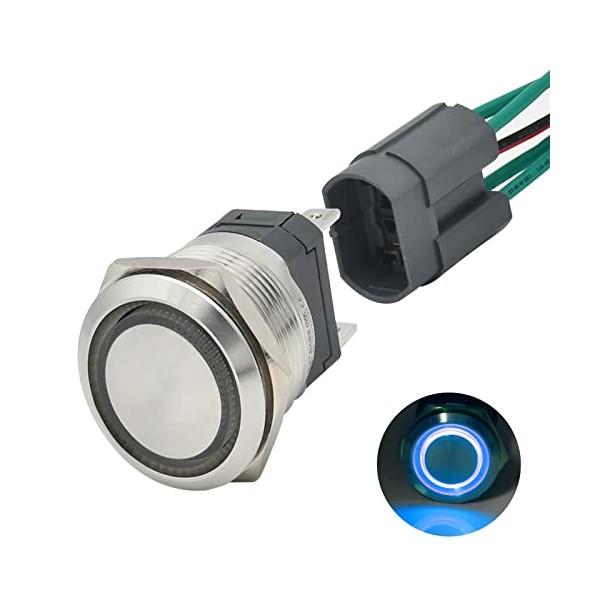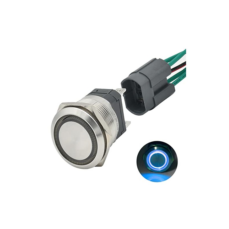 22mm Push Button Switch 15A 24V Latching Momentary 2NO DPST Angel Eye LED Stainless Steel Round Self-Locking 7/8'' with Wire Socket