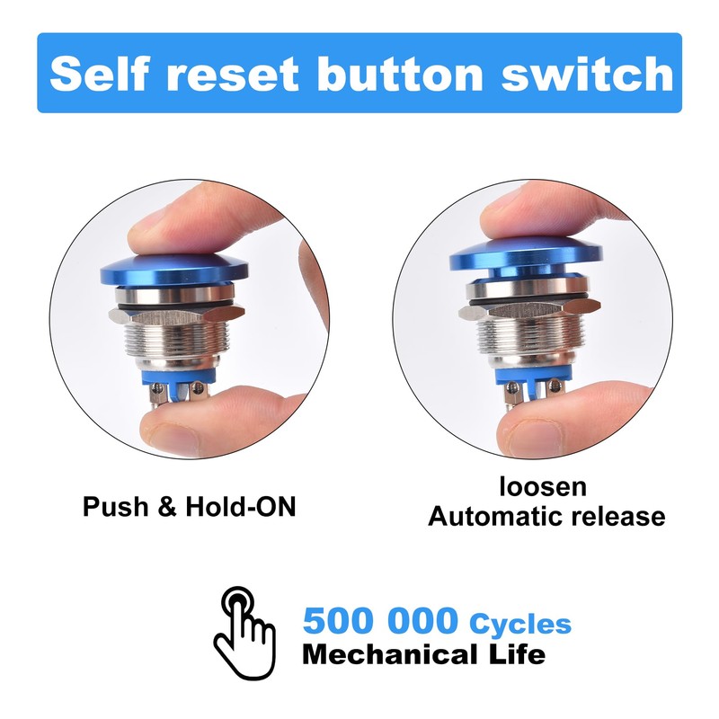 22mm Self Reset Push Button Switch Metal Mushroom Head Round Start Button AC/DC 12V-250V, Domed Screw Terminal, Suitable for 0.86 '' mounting Hole(Blue)