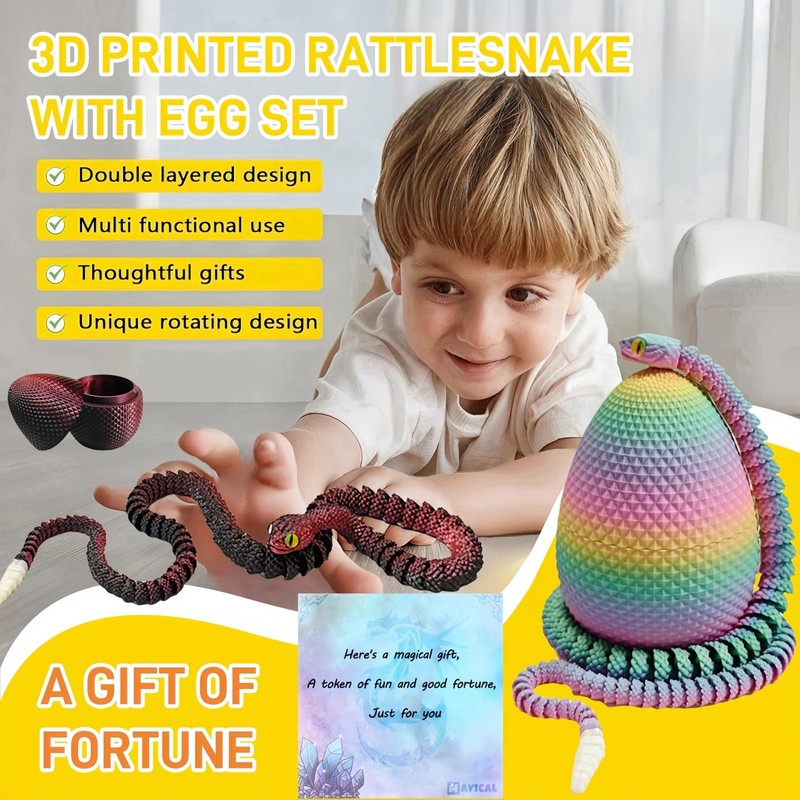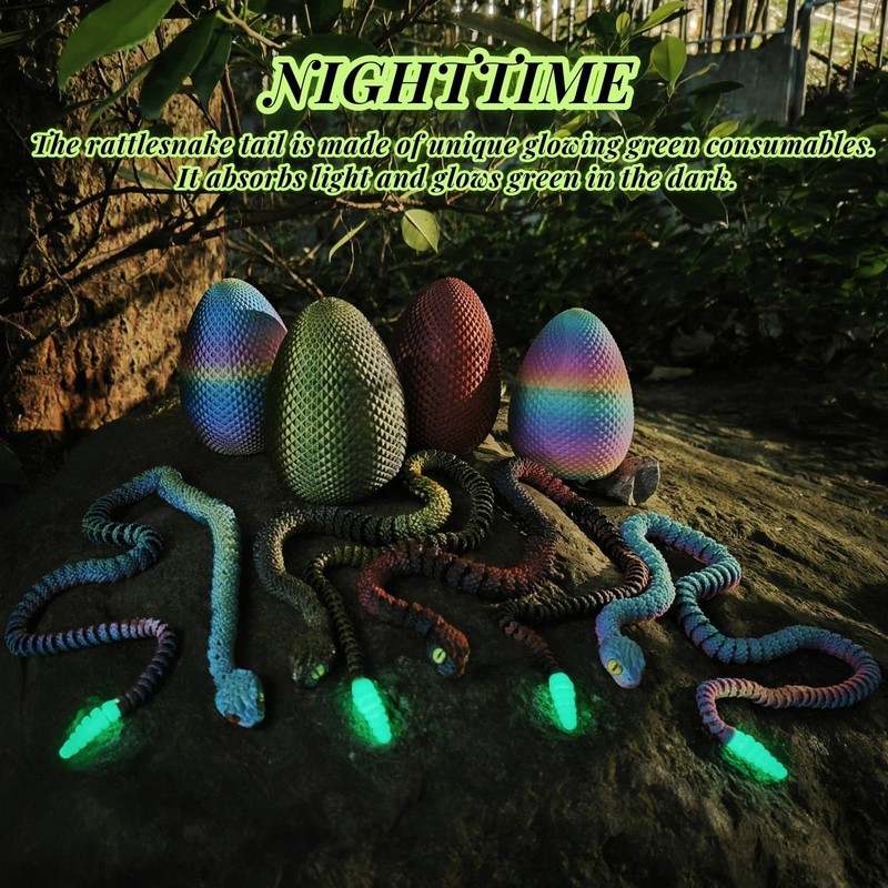 - 【UNIQUE 3D PRINTED DESIGN】With peculiar angular 3D printed snake in the egg set is crafted using advanced 3D printing technology, taking hours to produce. Each detail of the eggshell, scales, and tail is meticulously designed. The 4.13inch tall snake egg features a beautiful color gradient, while the 23.23inch snake body is connected with clever hinges, easy to create dynamic poses, allows you to pose as you like.
