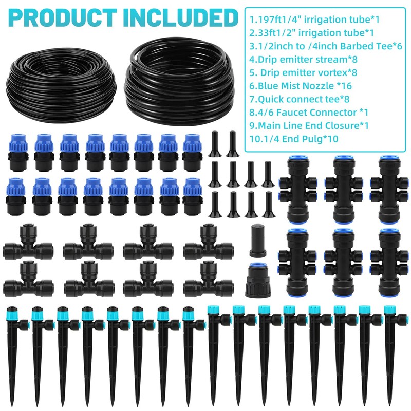 - 【Product Includes】A complete system featuring 197 feet of 1/4-inch irrigation tubing, 33 feet of 1/2-inch irrigation tubing, and various connectors, totaling 62 pieces. It covers a large area, eliminating the need for manual watering.