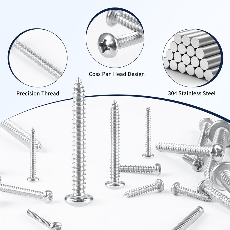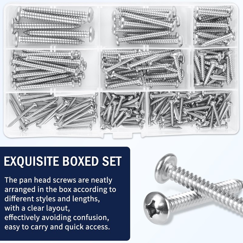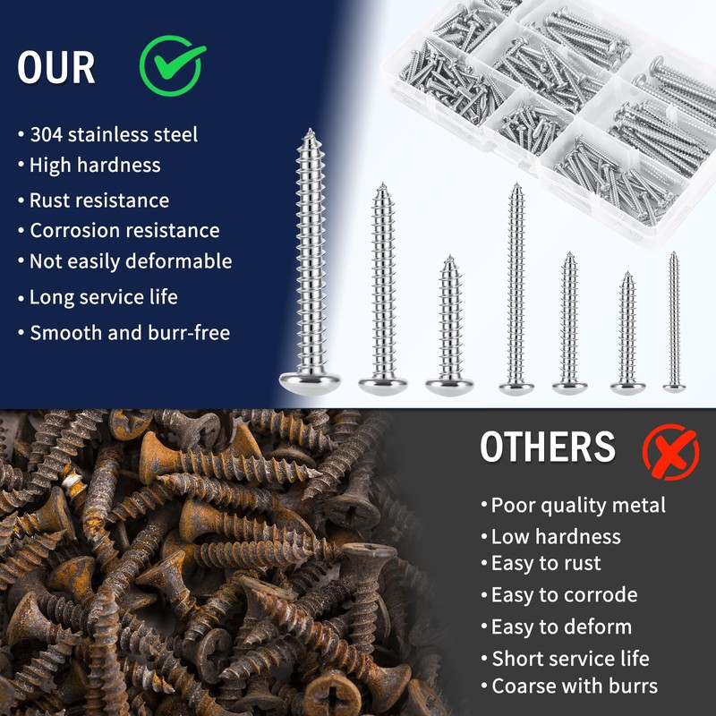 -Our self tapping screws metal set is made of selected high quality 304 stainless steel, durable and rustproof, exquisite craftsmanship, ensure safety and stability, can effectively prevent loosening.