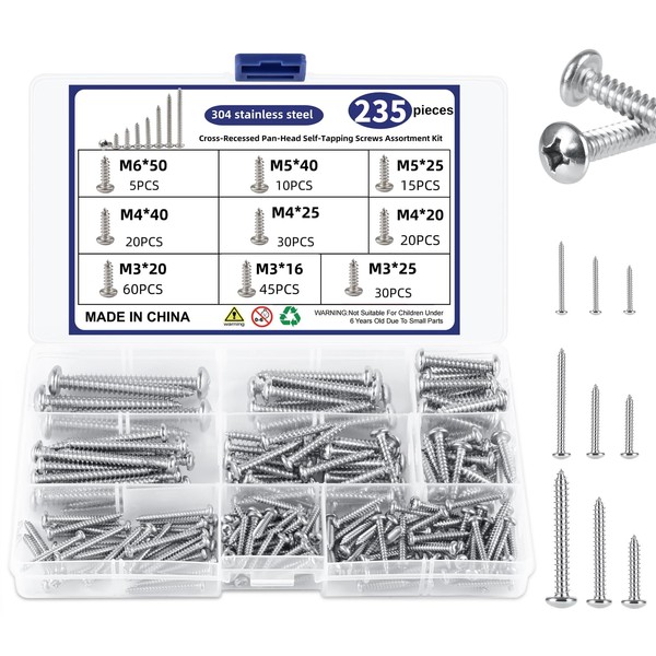 - Round head Phillips tapping screws set includes M3-16mm * 45pcs,M3-20mm*pcs, M3-25*30pcs,M4-20mm*20pcs,M4-25mm*30pcs,M4-40mm*20pcs,M5-25mm*15pcs,M5-40mm*10pcs,M6-50*5pcsOur bolts and nuts are available in four sizes, total 235pcs, which can easily meet your daily fastening needs. 5pcs