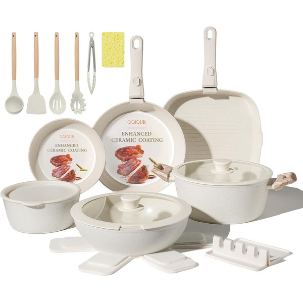 23Pcs Ceramic Cookware Set Non Stick Pots and Pans Set Non Toxic with Detachable Handle Induction Kitchen Cookware Set Space Saving, Oven & Dishwasher Safe, Cream White