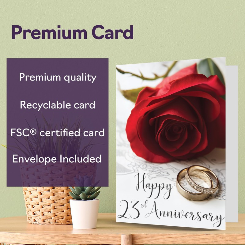 - Make them smile with this special anniversary card - This exceptional quality anniversary card for her or him shows the beautiful red rose and gold rings design that says: 'Happy 23rd Anniversary'. If you are looking for anniversary cards for women or anniversary cards for men then then this happy anniversary card is bound to make them smile. Not just a anniversary card for adults this could also be for Mum, Dad, Brother, Sister, Son, Daughter, Auntie, Uncle, Cousin or Friends.