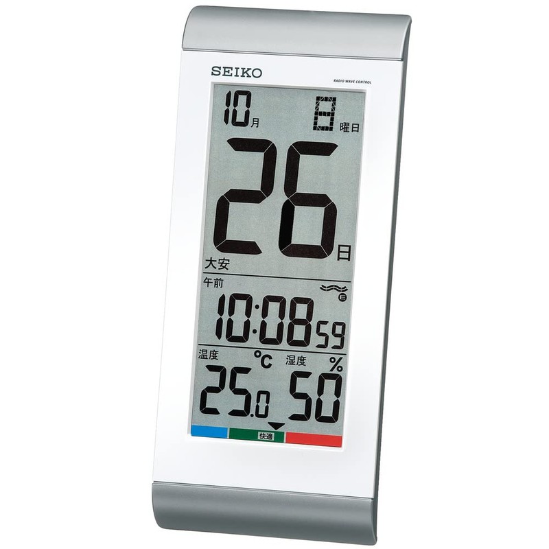 セイコークロック 置き時計 目覚まし時計 掛け時計 電波 デジタル 日めくりカレンダー 温度湿度表示 銀色メタリックメタリック 本体サイズ:24.2×10...