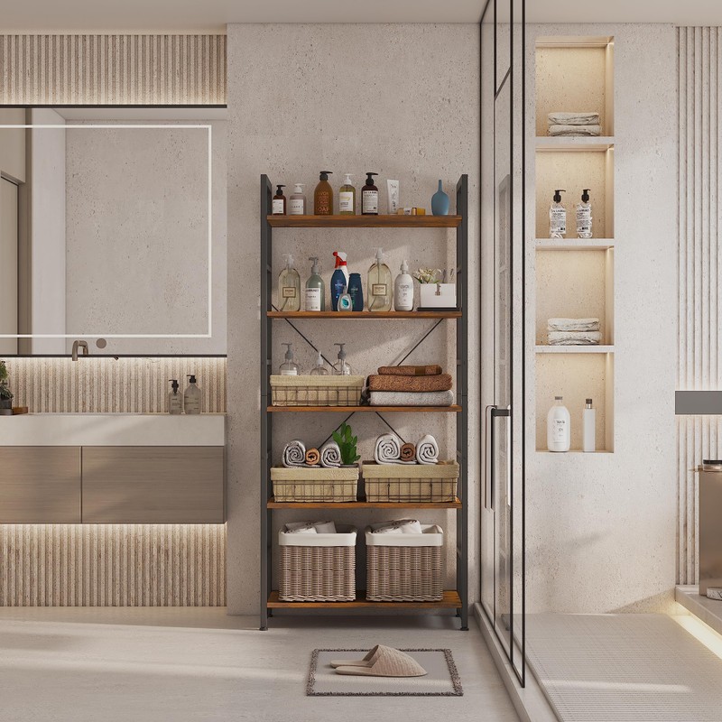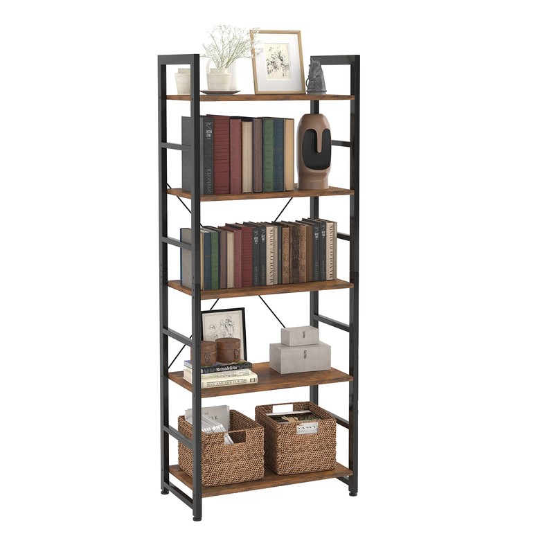 24" Bookshelf, 5-Tier Ladder Shelf, Industrial Bookcase, Wooden and Metal Storage Rack, Shelving Unit for Living Room Entryway Office, Rustic Brown Book Shelves