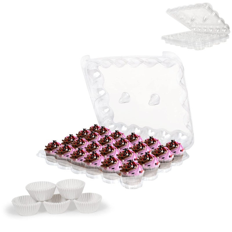 - SET OF 5 STACKABLE MINI CUPCAKE CONTAINERS - 5 trays x 24 = 120 cupcake slots - each box holds two dozen cupcakes