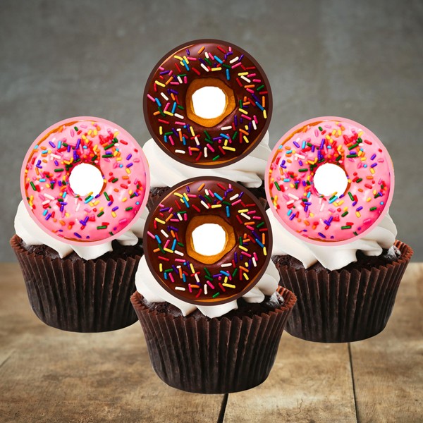 24 Doughnuts Edible Cupcake Toppers, (PRECUT Optional) Donuts Premium Thickness SWEETENED VANILLA, Wafer Card Cupcake Decorations (PRECUT)