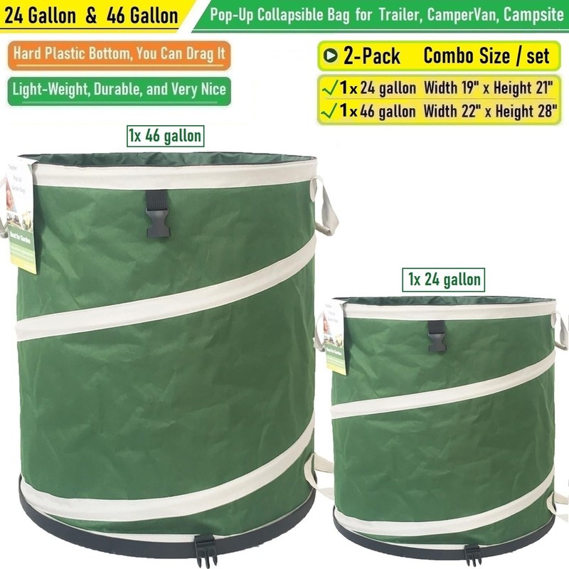 • 2-Pack, 24 Gallon and 46 Gallon Collapsible Trash Can with Solid Bottom, Collapsible Yard Garden Bag with Drawstring Cover: The collapsible pop-up garden bag has a hard shell plastic bottom, you can drag it on the ground as you want. You will have less stress on yard garden works. Very handy, sturdy yard waste bag. It's great for leaf bag,lawn debris,yard waste disposal and debris removal,household trash container,kitchen waste bin,pop-up trash can,office recycle bin,workshop trash container