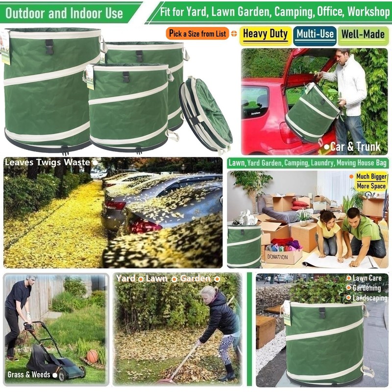 • 4-Size Select, Multi-Purpose Yard work Bag, Lawn Garden Debris Bag; Household Storage Bag and Collapsible Trash Can for Outdoor and Indoor: This pop-up collapsible bag is made from strong fabric with reinforced seams sewing stiches. Collapsible trash can great for Indoor and outdoor,Landscaping Debris,grass clippings,shrubbery trimmings and branches,thorn bush clippings,grass clippings,mulch and leaves,dead plants and flowers,old sod & dirt,household storage bag,moving apartment bag