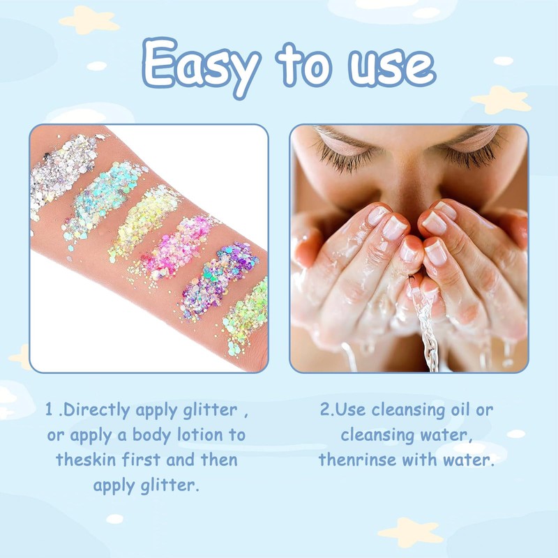 - EASY TO APPLY AND REMOVE Our sequins are designed to be easy to apply and remove. Mix glitter stones with primer powder or glue before applying festival accessories to achieve a long-lasting effect that lasts all night. Whether you are applying a festival glitter for the first time or are an experienced make-up artist, face glitter can be applied quickly and easily.