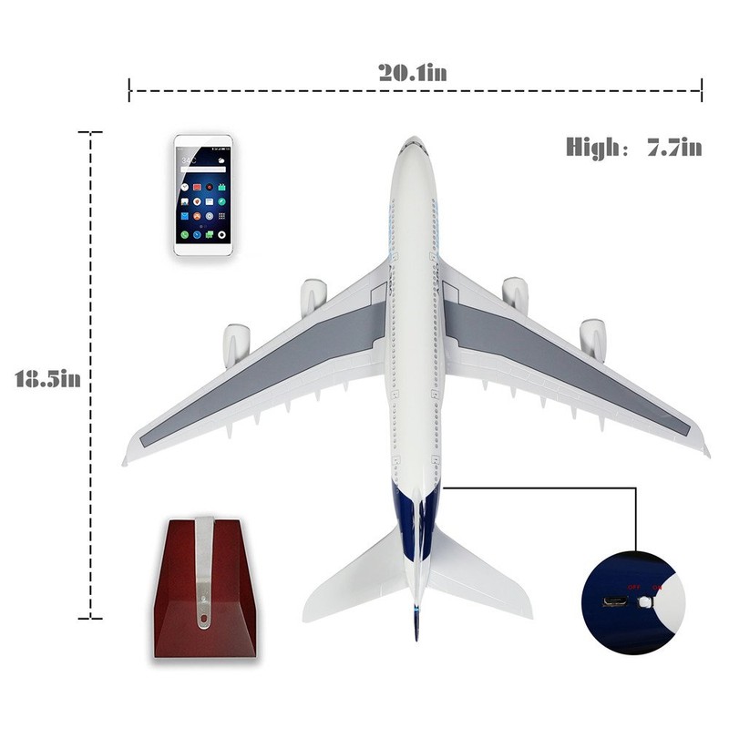 Automatically turn on the large model aircraft, at midnight, your door opening sound or footsteps will make it brighten, fully demonstrated its charm in the dark, and its automatic extinguishing function will not be too power-consuming. The package which sent to you will contain a USB charging cable suitable for this model. It can be connected to the computer's USB port, or the charging plug, it’s very convenient. The fuselage length is 17.32 inch, width (distance between the top of the two wings) is 18.5 inch, height (base to the roof) is 7.08 inch.This attractive large-scale airplane model is suitable for festivals gift and most people, such as friends, family, lovers, and business partners and so on.