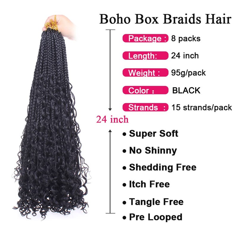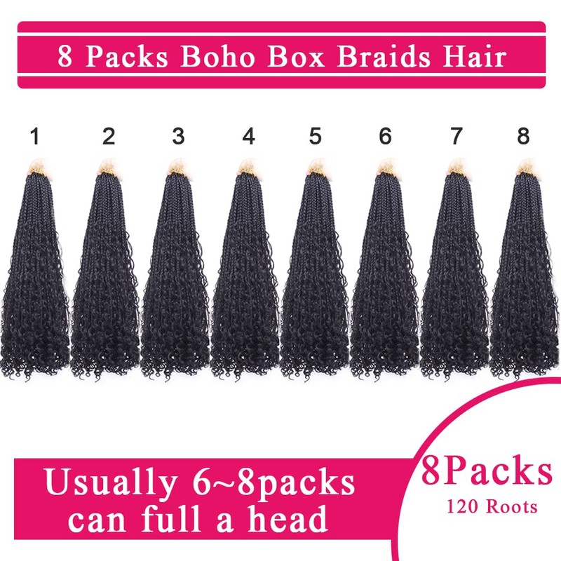 - Package:Boho Box Braid Crochet Hair is 15 strands/Pack,8 Packs/Lot,total 120 strands ,24 inch long,This bohemian Box Braids Crochet Hair comes with Free Hook,Rubber bands.