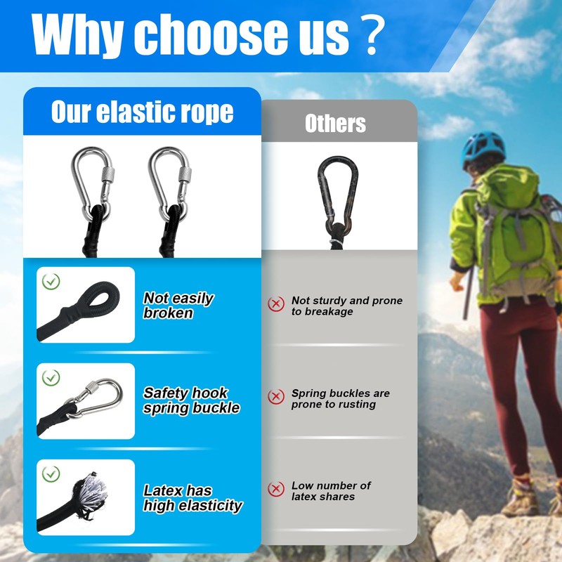 - 【Multifunctional bungee cord】:Bac-kitchen Outdoor Heavy Duty Bungee Cord, each bungee cord is constructed from high-quality PP wire and rubber core. It has an advantage in both length and width over ordinary bungee cords. It has stronger carrying capacity and can meet your higher requirements. Each bungee cord is paired with a high-quality stainless steel screw locking carabiners make it more firm. Can be used indoors and outdoors.