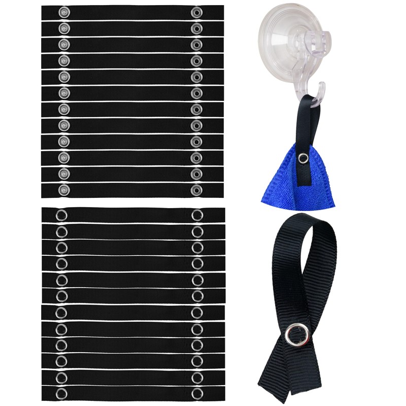 - Pack of 24 hanger loops for textiles, loops tabs in black, made of polyester, 150 x 12 mm, press stud box and plug parts are riveted at the ends of the towel loops