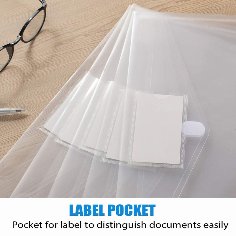 - Design with Hook & Loop Closure and Label Pocket: High-quality translucent document bag with hook & loop closure, easy and convenient to take and store lightweight things, and durable to last long after multiple repeats. Plastic Envelopes have a pocket for labels to distinguish documents easily.