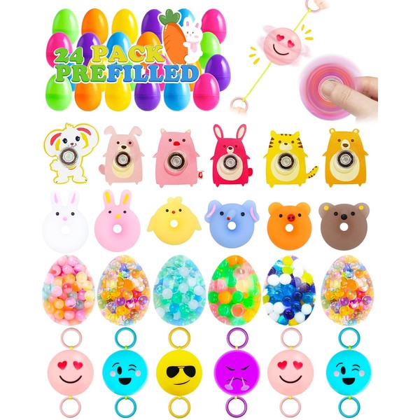 24 Pack Prefilled Easter Eggs, Plastic Easter Eggs with Toys Inside, Includes Rotating Balls, Fidget & Squishy Toys for Kids Egg Hunt, Basket Stuffers Fillers, Classroom Prize and Party Favors