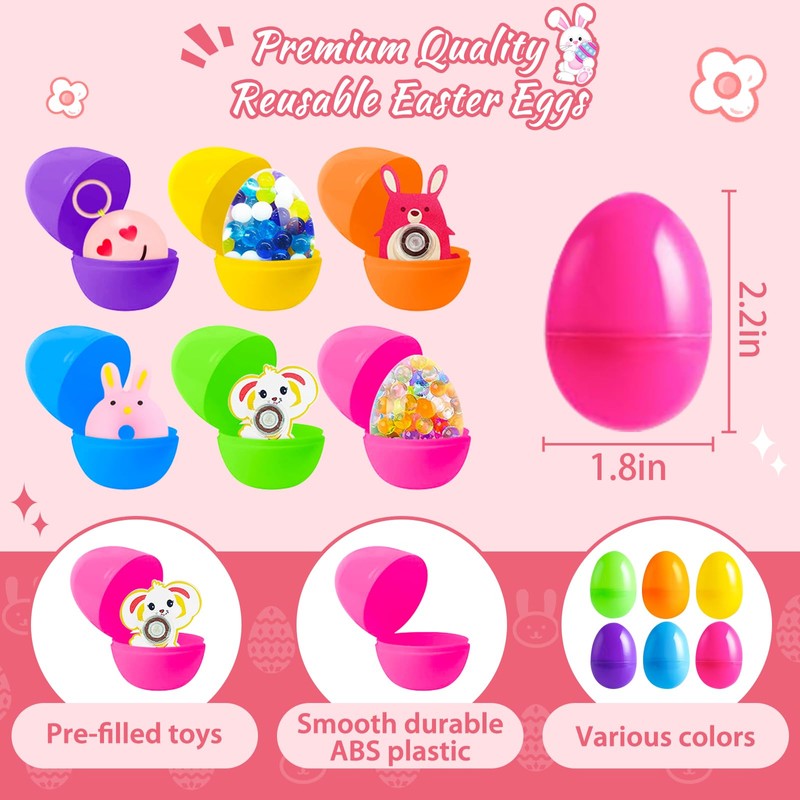 - High-Quality Materials: These easter eggs bulk are made of durable ABS plastic, measuring 2.2 inches high and 1.8 inches in diameter. Custom-designed hinges keep the top and bottom securely together. Filled with cute and fun toys, they are perfect for toddler easter basket stuffers.