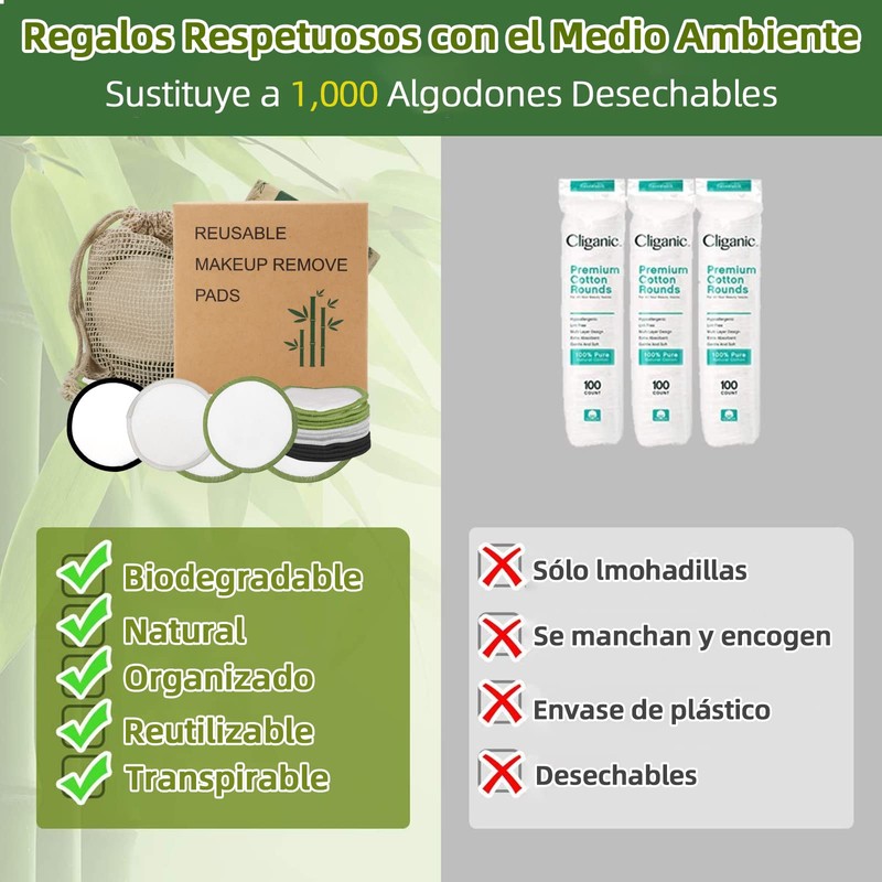 - 🌱【Respetuoso con la Tierra & Sin Residuos】Sustituye las toallitas desmaquillantes, las esponja desmaquillante reutilizables o las toallitas de papel. Las pads desmaquillantes ecológicas pueden lavarse y reutilizarse cientos de veces, ahorran dinero y reducen los residuos de los vertederos. Una vez que han llegado al final de su ciclo de vida, son compostables. Venga! Hagamos nuestra parte por el medio ambiente!