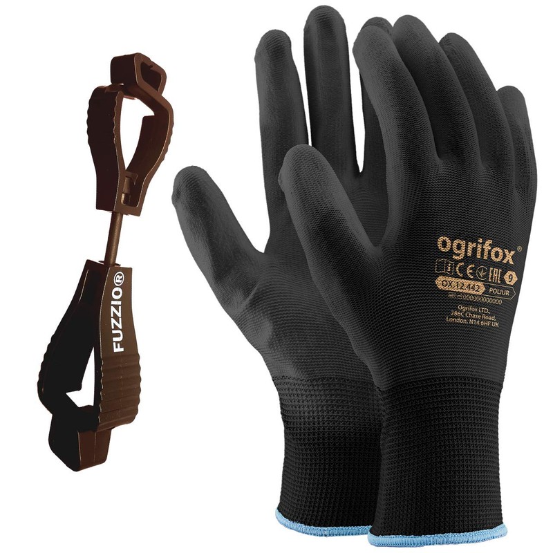 24 Pairs Ogrifox Polyurethane Coated Work Gloves with Fuzzio Glove Clips, black