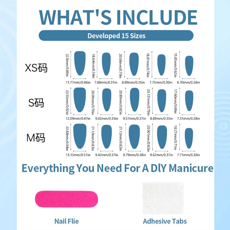 How to use it? 1.In order to make the fake nails more fit and not easy to fall off, it is recommended to trim the shape of the fake nails before wearing, so that it can be more complete on the nails; 2.Trim your nails to remove grease from them and keep them clean and dry; 3.Apply an appropriate amount of glue or jelly glue to the inside of the selected finger; 4.Press the fake nail against your own nail and hold for 20 seconds;