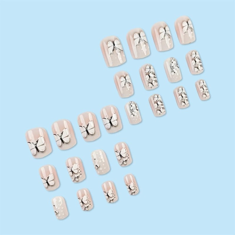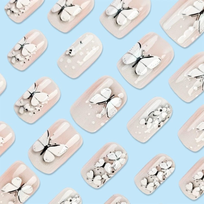24 Pcs Butterfly Press on Nails Short Square Fake Nails with 3D Relief Rhinestone Designs White French Tip Glue on Nails Press ons Matte False Nails White Gradient Acrylic Stick on Nails for Women