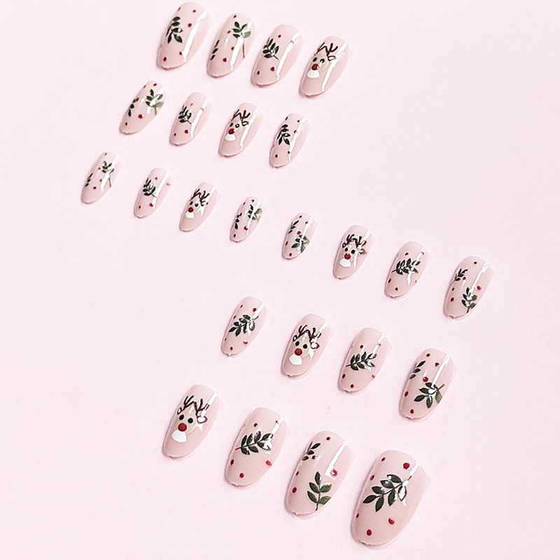 24 Pcs Christmas Press on Nails Medium Almond Nude Fake Nails Glossy Full Cover Glue on Nails Xmas False Nails with Cute Elk Desisgns for Women and Girls