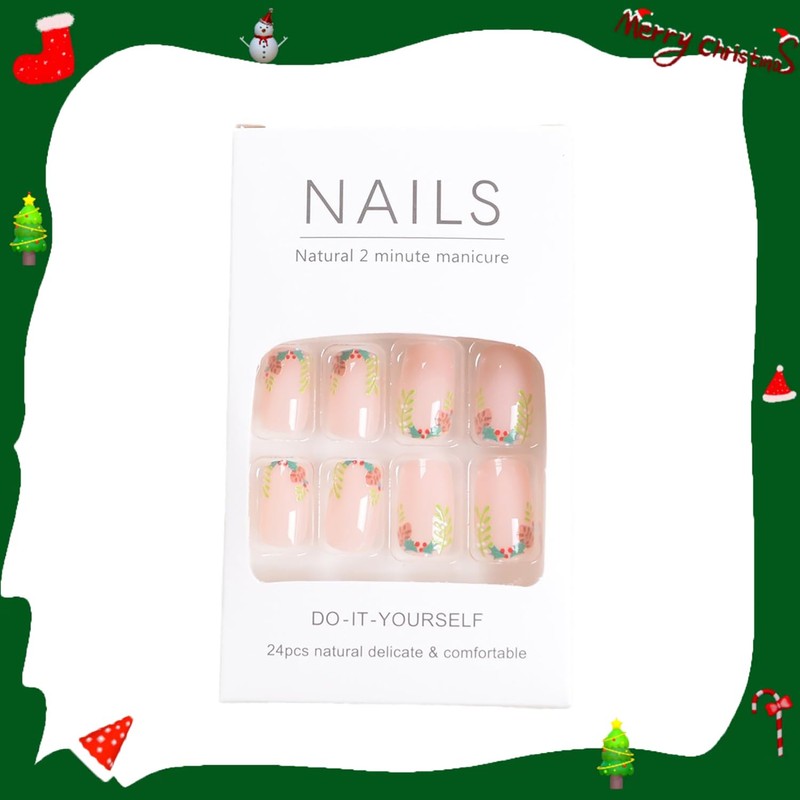 24 Pcs Christmas Press on Nails Medium Square RIICFDD Nude Fake Nails with Holly Tree Pattern Designs Christmas Nails Glossy Full Cover Stick on Nails Reusable Xmas for Women and Girls False Nails