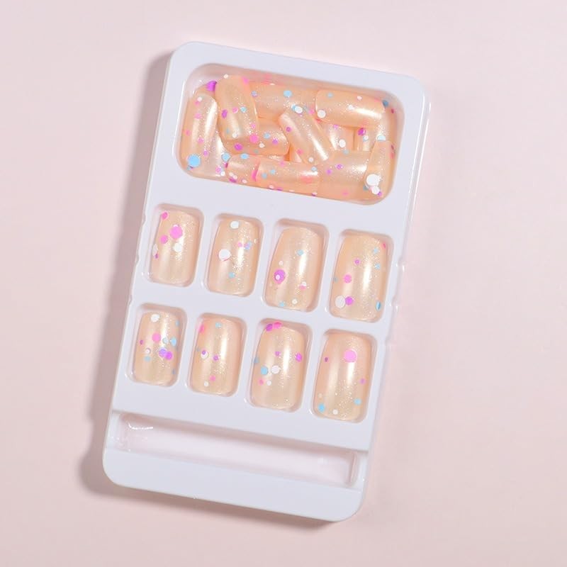 24 PCS Clear Pink Press on Nails Medium Square Summer Cute Fake Nails Press Ons Acrylic Nail Art Tip Kit Full Cover Summer False Nails Glue on Nails with Colorful Dots Design for Women