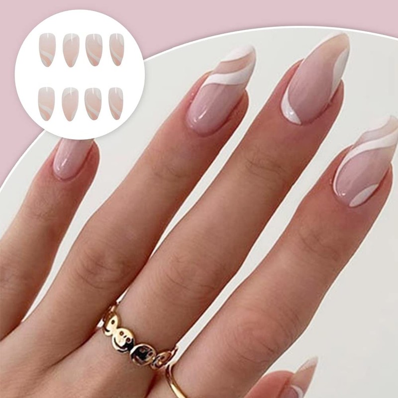 24 Pcs Fake Nails Curve White Line False Nails Thin Artificial Nails for Party and Daily Life