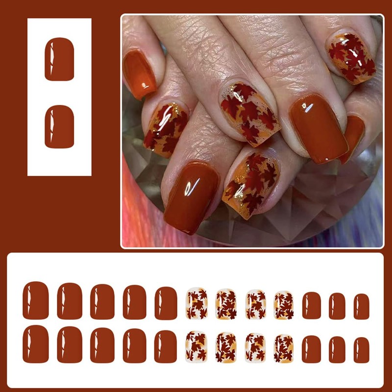24 Pcs Fall Press on Nails Short Square,ZWENJIE Brown Red Fake Nails Press ons Nail Kit Tips with Maple Leaf Thanksgiving Design Full Cover Acrylic Glossy False Nails Glue on Nails for Women Manicure