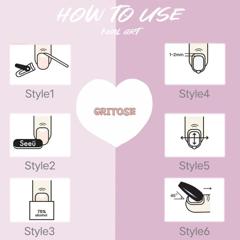 2.Choose the size that best suits your nails, gently polish the nails and false nails with our complimentary nail file to get a better fit.