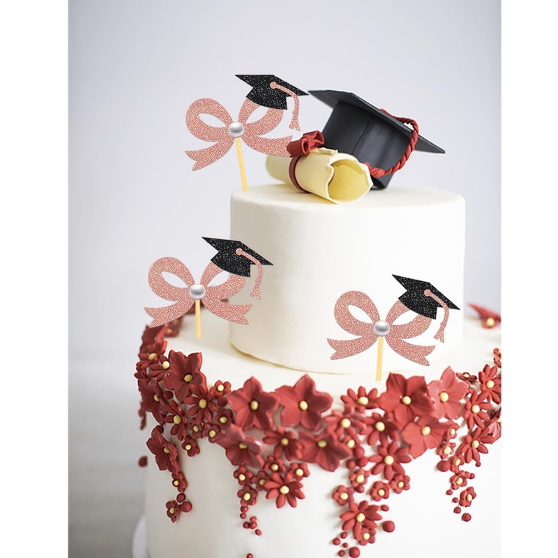 24 Pcs Gold Bow Graduation Cupcake Toppers, Grad Bow Cupcake Picks- Class of 2025 Cupcake Toppers for Graduation Party Decorations (Rose Gold)