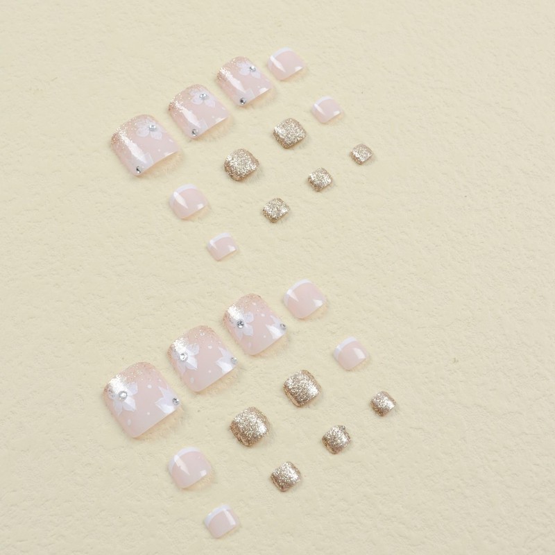 24 Pcs Gold Glitter Press on Toenails Short Square - Flowers Fake Toenails White French Fake Toe Nails Press Ons with French Tips Design Full Cover Acrylic Toenails Kit for Women Manicure