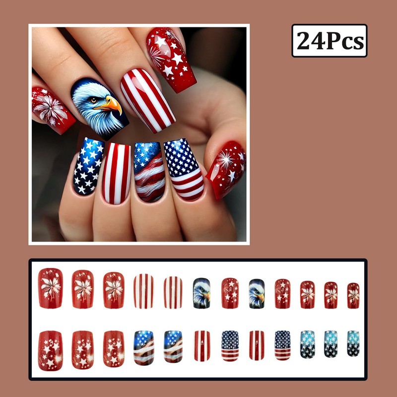 - Patriotic Style: Celebrate Independence Day with these red, white, and blue fake nails designed with iconic American symbols - stars, stripes and eagle - perfect for parties, barbecues, or fireworks nights on July 4th