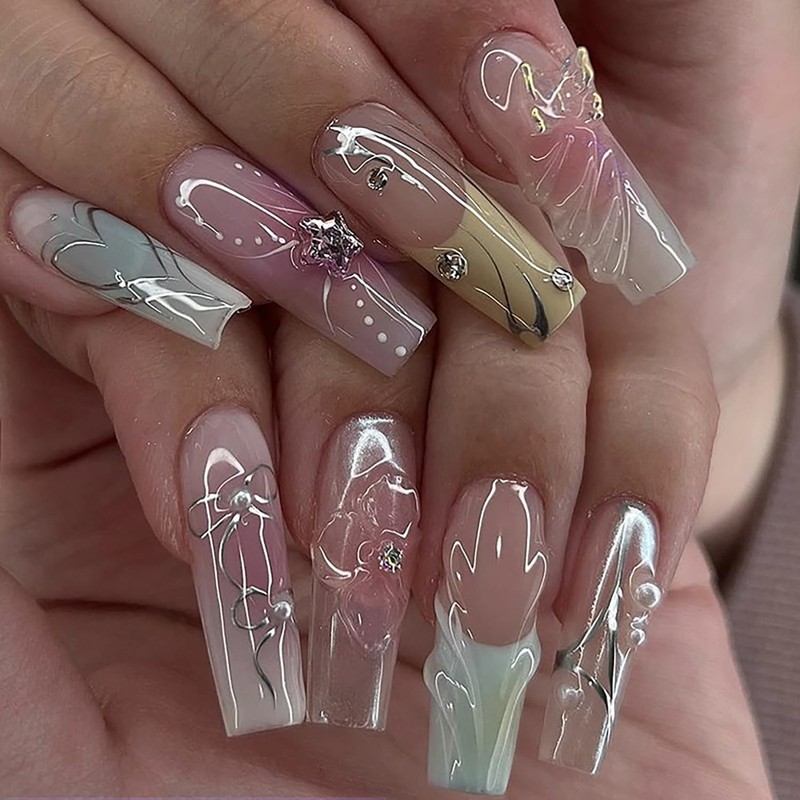 - Cute Design: These artificial false nails with 3D design fully showcases the atmosphere of holiday, making your fingers more cute and shining. I think you will definitely like this box of long coffins with pressed nails