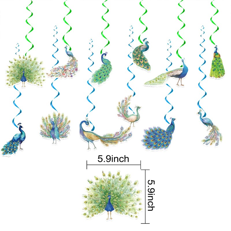 - Peacock Birthday Decorations: Package includes 24 pcs hanging swirls ( 12 styles, 2 each style). Enough to meet your peacock party decoration needs.