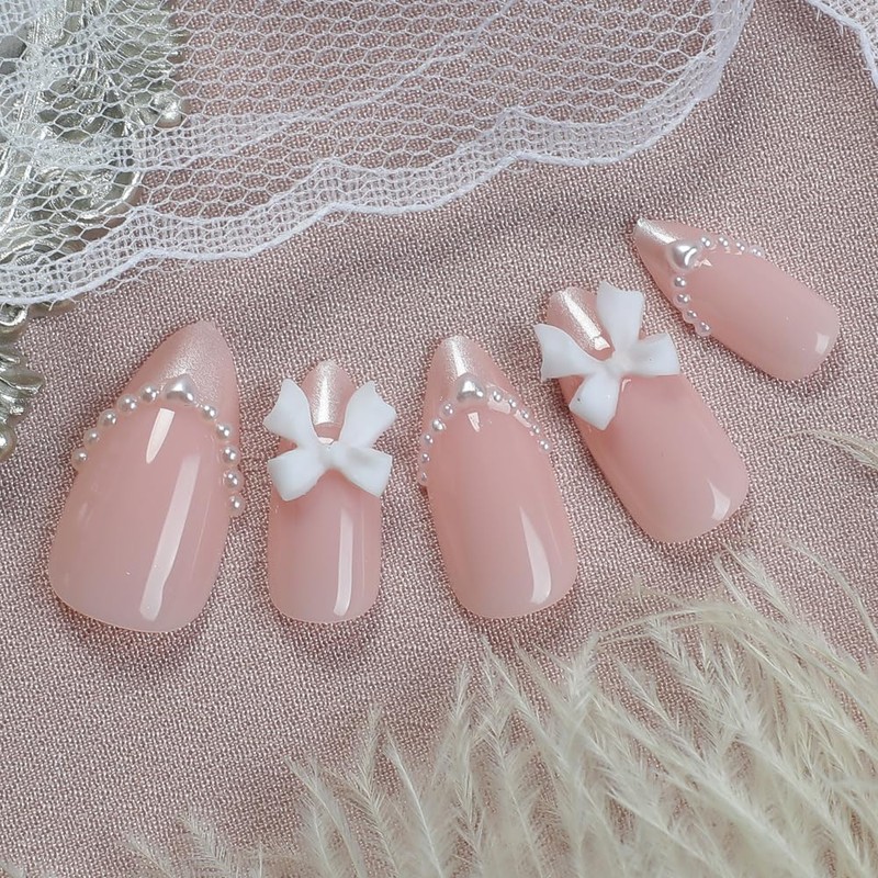24 Pcs Pink Press on Nails Short Almond Nail Tips,YEFIUO 3D Bow Acrylic Nail Kit Glitter French Fake Nails Press ons Glue on Nails Full Cover Reusable False Nails with Strong Jelly Glue Tool for Ma'am