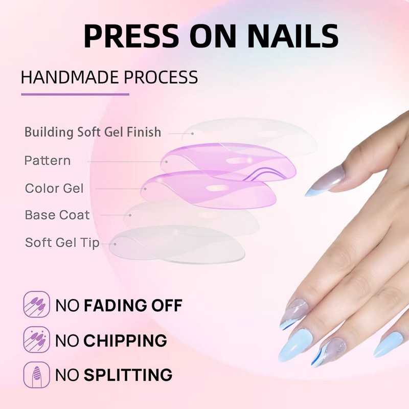 - 【Stylish Almond Nail】Our fake nails come in different textures and shapes (almond and long square), with romantic elements such as French style, lines, and butterflies.They are easy to match with your everyday style and suitable for daily time and important occasions.