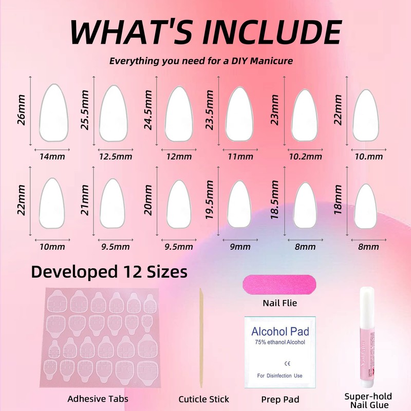 - 【Gel Nail Kit】Get 24 pieces of press on nails medium, along with all the accessories you need to apply them - adhesive stickers, double-sided nail file, wooden stick, and alcohol pad.You have everything you need to create beautiful nail art at home.