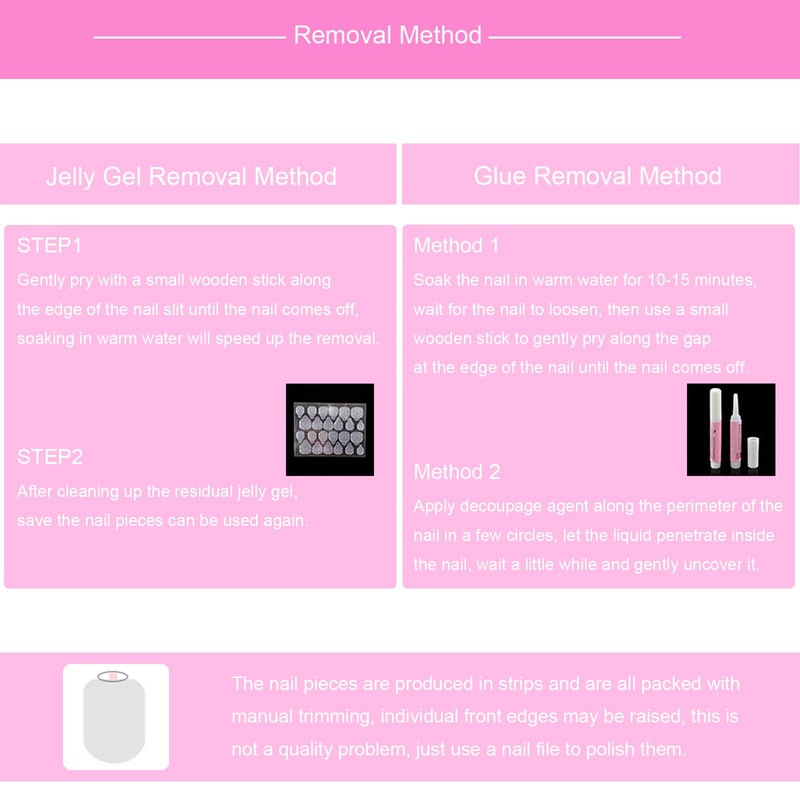 🍁Jelly Gel Removal Method:Gently pry with a small wooden stick along the edge of the nail slit until the nail comes off, soaking in warm water will speed up the removal.