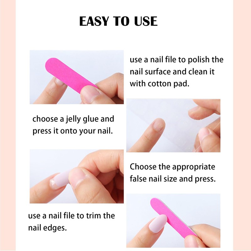 3.Applying these press on nails is quick and hassle-free. The included adhesive tabs ensure a secure fit, So you can confidently go about your daily activities without worrying about them falling off.