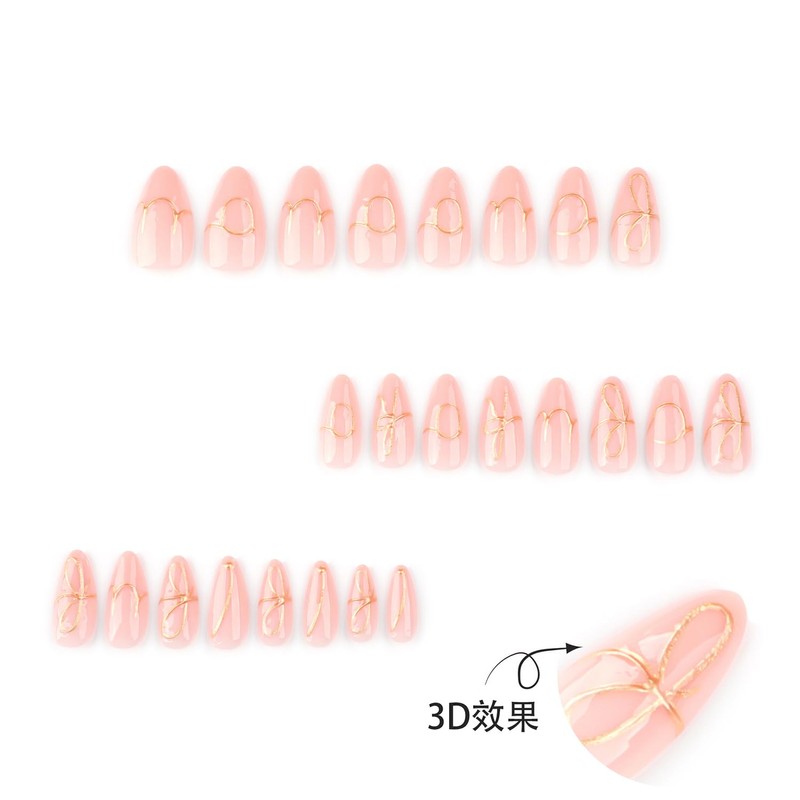 24 Pcs Short Almond Press on Nails Nude Pink Fake Nails 5D Goldn Lines Designs Cute Bow False Nails Glossy Full Cover Acrylic Nails for Women Girls