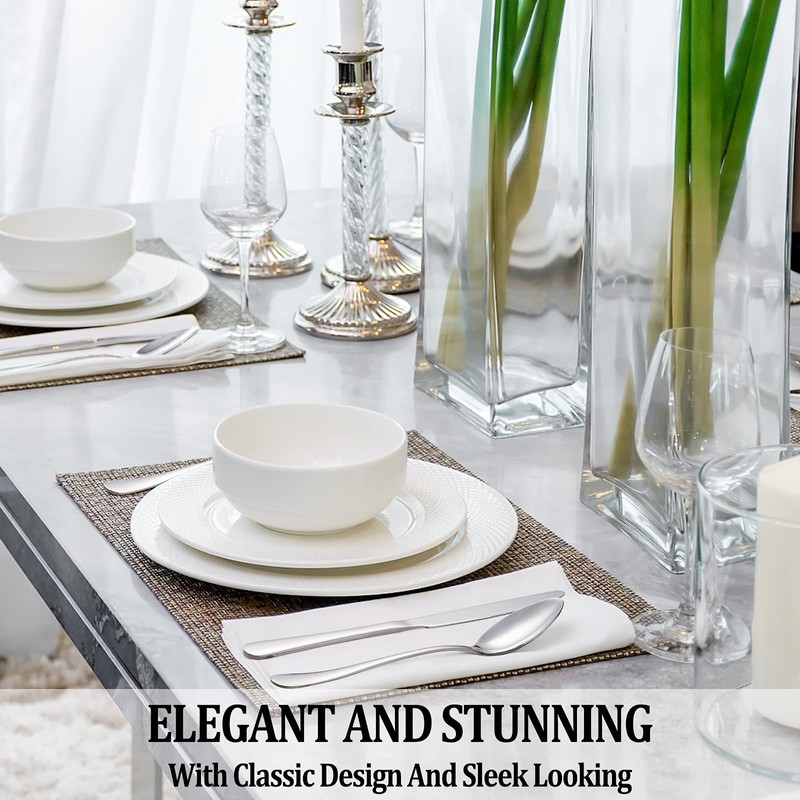 - 🍽【ELEGANT SHAPE AND EXQUISITE WORKMANSHIP】: Highly mirror polished, smooth edges and the classic shape design make this flatware set stunning and look expensive. It is very suitable for all your home styles and can match any tableware you have. There are no rough spots or sharp edges, very comfortable to use without hurting your mouth at all.