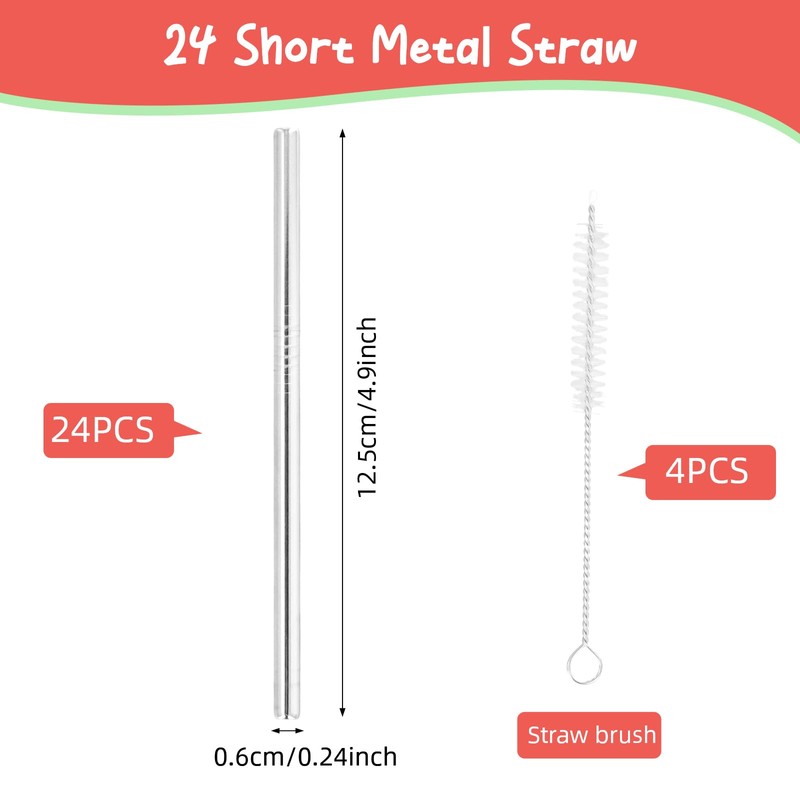24 Pcs Stainless Steel Straws, Reusable Metal Drinking Straws with 4 Cleaning Brush, Small Reusable Straws for Kids, Short Metal Straws for Smoothie, Milkshake, Cocktail and Hot Drinks